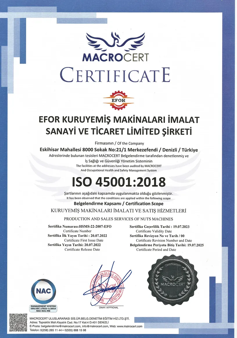 Efor makine , Gıda üretim tesislerinin ihtiyaçlarına uygun olarak tam otomatik kuruyemiş kavurma hatları üretmektedir. Daha az iş gücüyle önemli derecede maliyet ve zaman tasarrufu sağlayarak yüksek kapasitelerde üretim yapmanıza olanak sağlamaktadır.